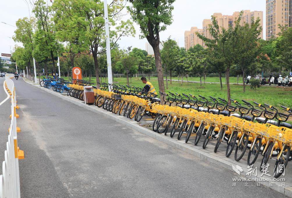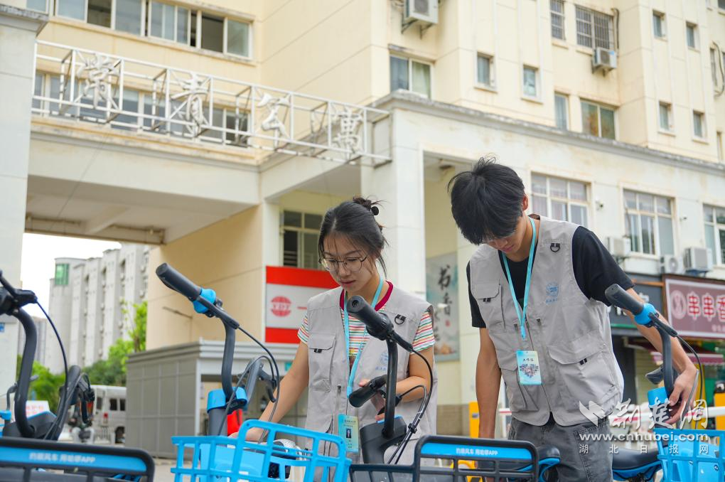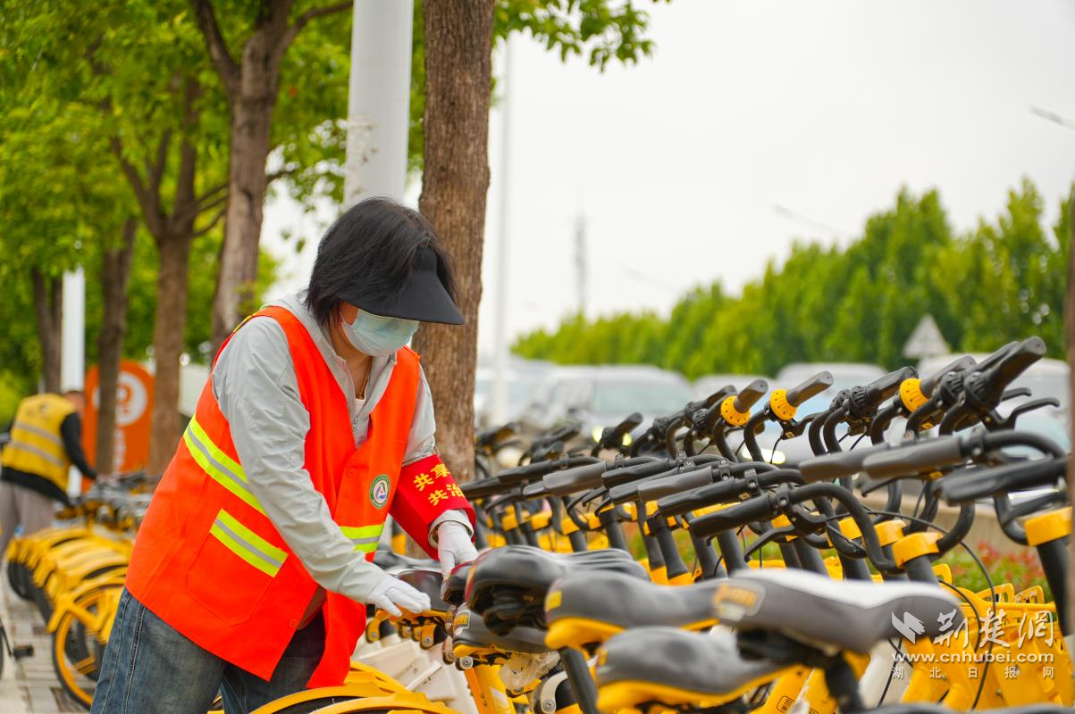武漢輕工大學(xué)學(xué)生志愿者參與單車(chē)擺放。