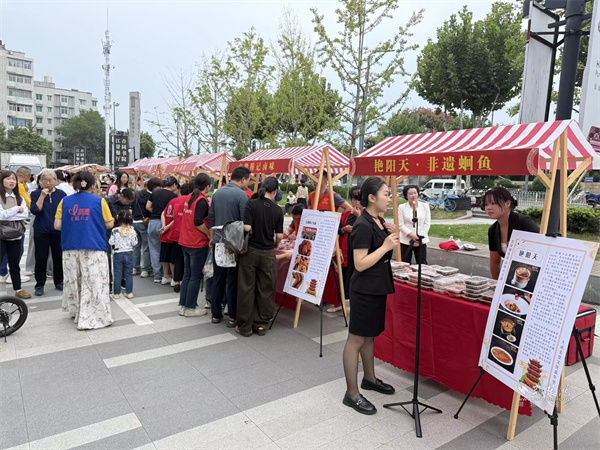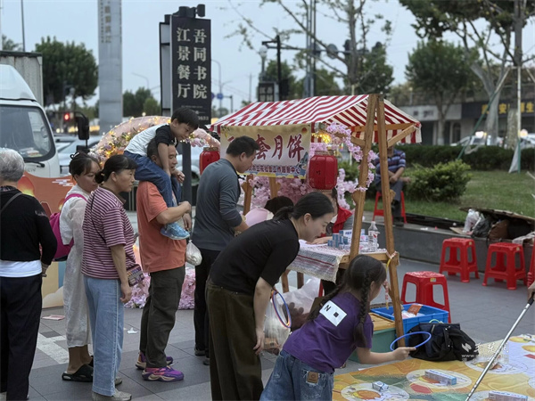 活動(dòng)現(xiàn)場(chǎng)設(shè)置市集區(qū)與演藝區(qū)兩大板塊。市集區(qū)內(nèi)人頭攢動(dòng),轄區(qū)共建單位、音樂(lè)企業(yè)與多家商戶積極參與,匯聚特色商品與音樂(lè)互動(dòng)體驗(yàn)。大音琴行展出多種樂(lè)器并銷售音樂(lè)周邊產(chǎn)品,吸引眾多武漢音樂(lè)學(xué)院學(xué)生及音樂(lè)愛(ài)好者駐足交流;元祖食品推出月餅、點(diǎn)心等節(jié)令糕點(diǎn)展銷,為中秋佳節(jié)提前預(yù)熱;艷陽(yáng)天·非遺鮰魚(yú)(黃鶴樓店)、中百倉(cāng)儲(chǔ)、九州上醫(yī)館及多家大成路特色美食商戶也紛紛設(shè)點(diǎn),讓市民在觀賞演出之余,盡享購(gòu)物與美食樂(lè)趣。