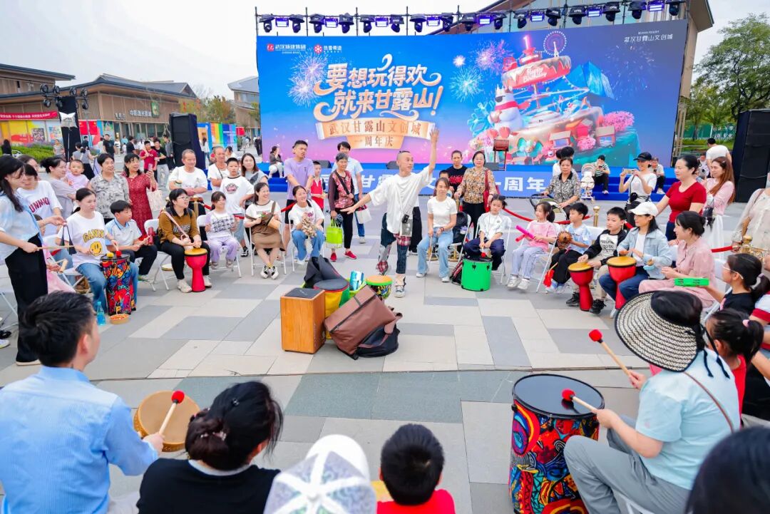 廣場正中,幾十名鼓手圍坐成圈,使用非洲鼓,在引導師帶領下共同演奏出悅耳的音樂。不少游客紛紛加入“百人手鼓派對”活動,學習非洲鼓演奏,現(xiàn)場氣氛熱烈。
