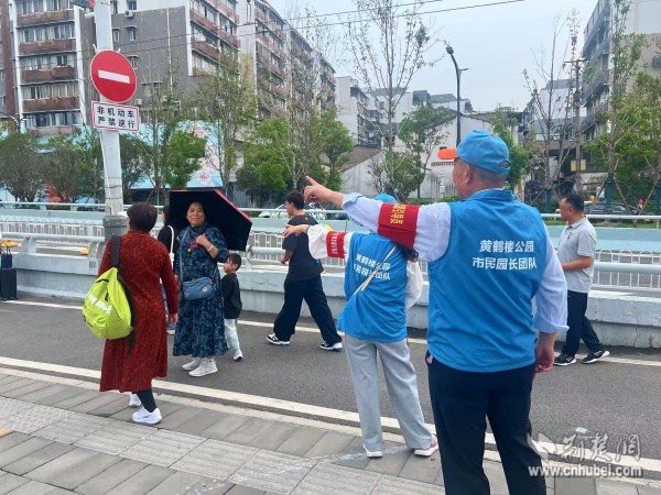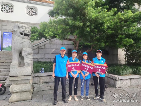 西廠口社區(qū)“市民園長(zhǎng)”志愿團(tuán)隊(duì)在黃鶴樓景區(qū)開(kāi)展文明引導(dǎo)與旅游咨詢。 通訊員供圖