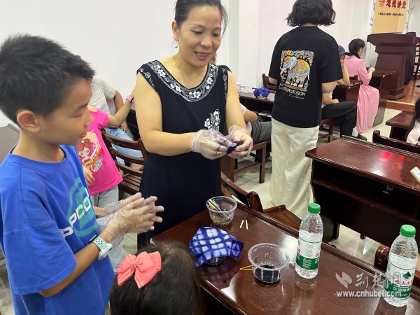 在動(dòng)手體驗(yàn)環(huán)節(jié),孩子們興致勃勃地嘗試各種扎結(jié)方法,家長(zhǎng)們?cè)谂约?xì)心協(xié)助。經(jīng)過(guò)精心捆扎與浸染,當(dāng)一塊塊布料被緩緩展開(kāi),呈現(xiàn)出獨(dú)一無(wú)二的藍(lán)白紋樣時(shí),現(xiàn)場(chǎng)響起陣陣驚嘆?;顒?dòng)不僅提升了孩子們的動(dòng)手能力與專注力,更讓他們深切感受到傳統(tǒng)技藝的魅力與勞動(dòng)的喜悅。