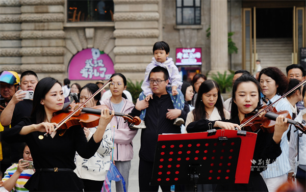 來自阿曼的游客Murad Al Balushi難掩興奮,特意讓朋友為自己和樂團拍下合影?!斑@場演出太精彩了,現(xiàn)場的氛圍讓人沉醉,武漢街頭的這份浪漫很獨特?!盡urad Al Balushi表示。來自廣東珠海的游客曹先生,剛下火車便將江漢路作為旅途第一站,而這場音樂快閃成為他此行的意外之喜。“高雅音樂配上百年鐘樓的復古建筑,氛圍感直接拉滿,這趟旅行的開頭太完美了?!蔽錆h市民李女士帶著家人在休息日出游,剛從公交站下車就被樂聲吸引,“本來就是隨便逛逛,正好帶著寶寶感受一下音樂氛圍?!苯瓭h大學大四學生小劉和朋友一同被這場音樂“快閃”所打動,拍下視頻發(fā)朋友圈和大家分享。她表示:“武漢這座城市越來越有活力,總能給人驚喜?!?/p>