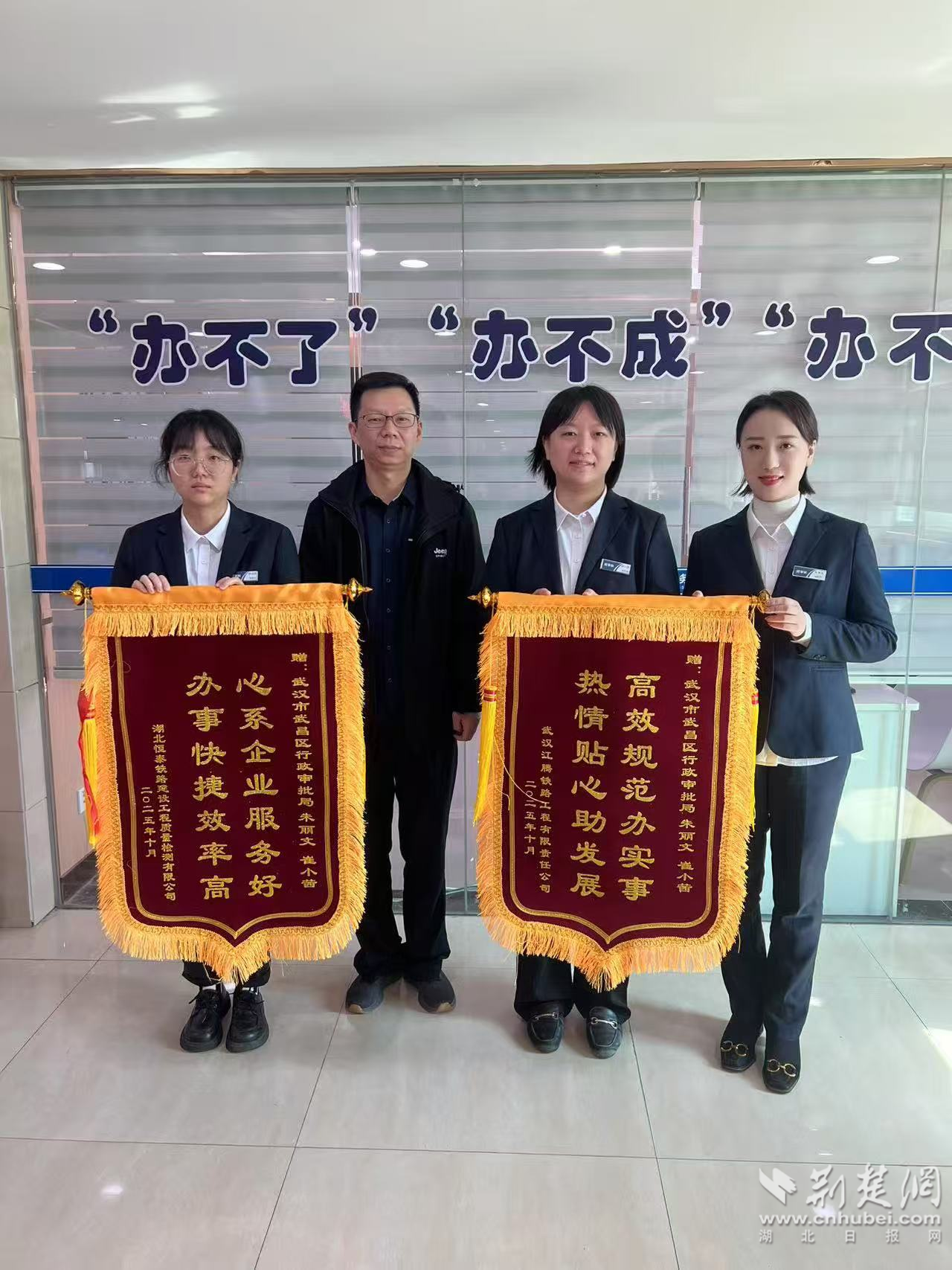 荊楚網(wǎng)(湖北日報(bào)網(wǎng))訊(記者 李燕 通訊員 李永波 王金丹)10月24日,中國鐵路武漢局集團(tuán)旗下湖北恒泰鐵路建設(shè)工程質(zhì)量檢測有限公司、武漢江騰鐵路工程有限責(zé)任公司,順利辦結(jié)業(yè)務(wù)變更手續(xù)后,經(jīng)辦人董先生專程送來2面錦旗,向武昌區(qū)行政審批局工作人員表達(dá)謝意。