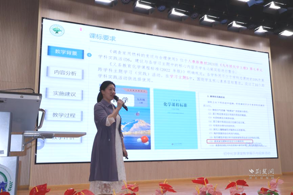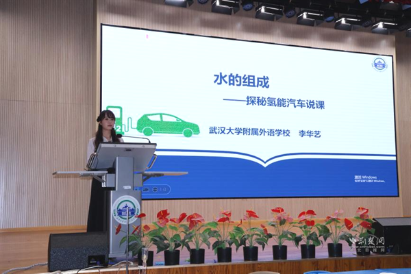 武漢大學(xué)附屬外語學(xué)校李華藝?yán)蠋焾?zhí)教《水的組成——探秘氫能汽車》展示課。課程以新能源汽車為線索,設(shè)計(jì)四大項(xiàng)目,學(xué)生通過海報(bào)、角色扮演等形式展示探究成果。李老師引導(dǎo)學(xué)生從宏觀、微觀、符號三重視角認(rèn)識水的組成,最終用電解產(chǎn)生的氫能讓小車現(xiàn)場行駛,實(shí)現(xiàn)化學(xué)與科技的有機(jī)融合。說課環(huán)節(jié)中,她介紹項(xiàng)目圍繞“氫能汽車如何工作”展開,借助AI模擬生產(chǎn)過程,讓學(xué)生感受化學(xué)的實(shí)踐價(jià)值。