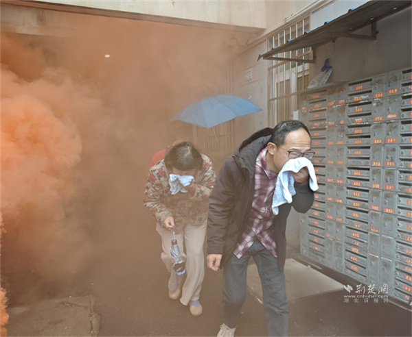 隨后,6棟居民樓模擬火災(zāi)疏散演練啟動。“煙霧彈點燃!滅火組壓制初期火源,疏散組組織撤離!”指令下達后,滅火組迅速攜帶器材沖進樓道撲救模擬起火點;疏散組手持熒光指揮棒,在樓層樓梯口、轉(zhuǎn)角處布控,引導(dǎo)居民彎腰捂鼻、有序撤離。