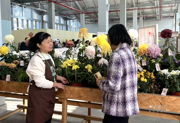 青山區(qū)紅衛(wèi)路街道才聚社區(qū)園藝師肖福英(左)與市民交流菊藝。通訊員供圖