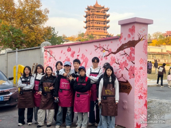 活動首日,志愿者們早早來到現(xiàn)場,分工協(xié)作完成物料搬運、防護鋪設等準備工作。隨著畫筆起落,原本單調(diào)的灰墻被溫柔的粉色調(diào)漸漸覆蓋,“武漢”兩個大字輪廓清晰浮現(xiàn),兩側(cè)櫻花枝椏初現(xiàn)雛形。在冬日的暖陽下,志愿者們俯身勾勒、抬手描繪,讓冰冷墻面開始煥發(fā)浪漫生機。