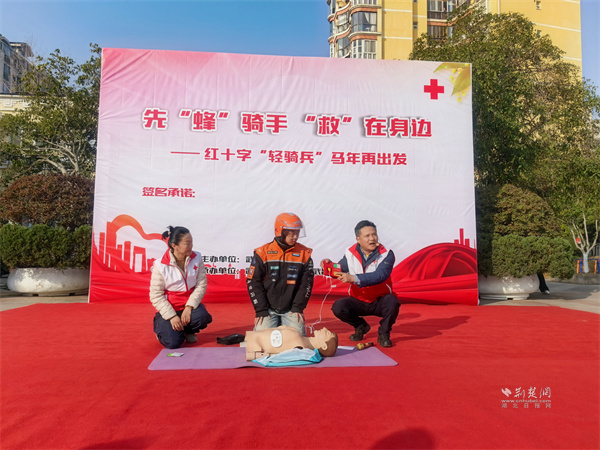 荊楚網(wǎng)(湖北日報網(wǎng))訊(通訊員 王瑜婷)1月15日,武昌區(qū)南湖街道寶安社區(qū)開展“先‘蜂’騎手,‘救’在身邊——紅十字‘輕騎兵’馬年再出發(fā)”主題活動。市、區(qū)紅十字會及南湖街道相關(guān)負(fù)責(zé)人,外賣、快遞小哥代表齊聚現(xiàn)場,共同見證這支由新就業(yè)群體組成的紅十字“輕騎兵”志愿服務(wù)隊再啟新程。