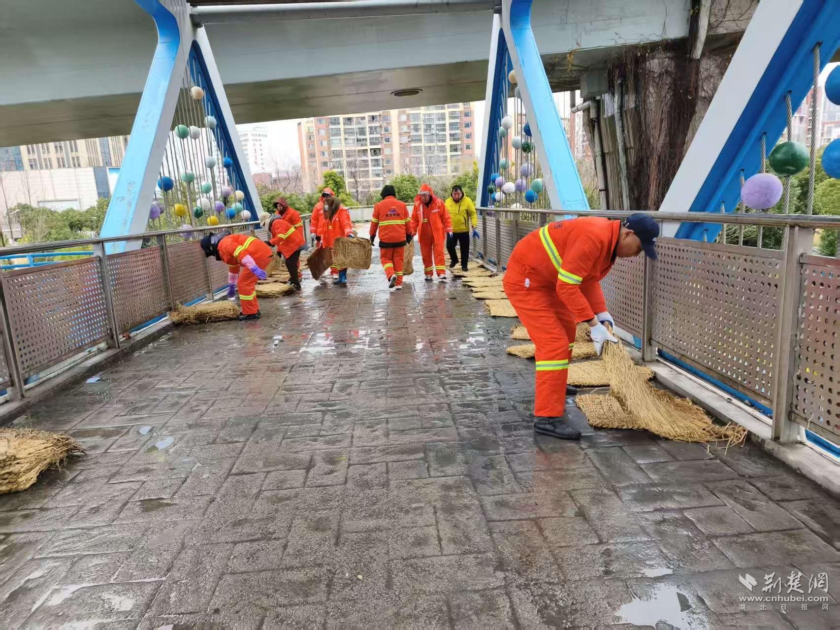 防滑措施同樣向行人集中區(qū)域延伸。19日17時(shí)起,吳家山環(huán)山路人行天橋上,環(huán)衛(wèi)工人與執(zhí)法隊(duì)員開始鋪設(shè)防滑草墊?!皹騼蓚?cè)是學(xué)校,晚高峰和早高峰人流集中,提前鋪設(shè)能減少滑倒風(fēng)險(xiǎn)?!眳羌疑浇志C合執(zhí)法中心副主任陳偉說。