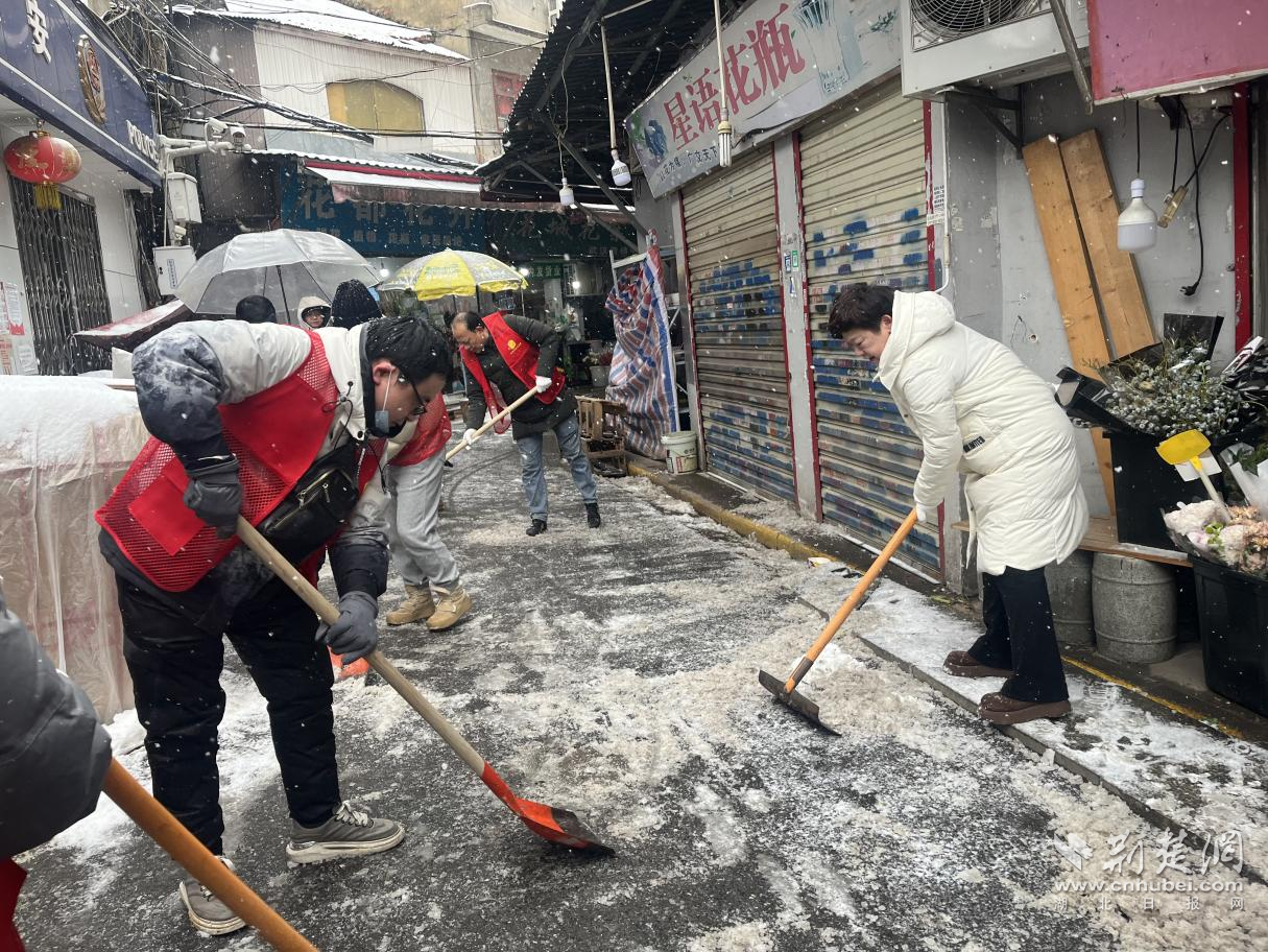 當(dāng)天清晨,清雪人員已在轄區(qū)出行要道、社區(qū)小巷等多個(gè)點(diǎn)位同步作業(yè)。街道機(jī)關(guān)干部帶隊(duì)下沉一線,來(lái)自轄區(qū)的多支力量陸續(xù)到位。江漢區(qū)科學(xué)技術(shù)協(xié)會(huì)、區(qū)湖泊管理所等單位黨員積極參與行動(dòng);新華路體育中心、南國(guó)中心等單位也主動(dòng)對(duì)接,紛紛派出人員和工具協(xié)同作業(yè)。