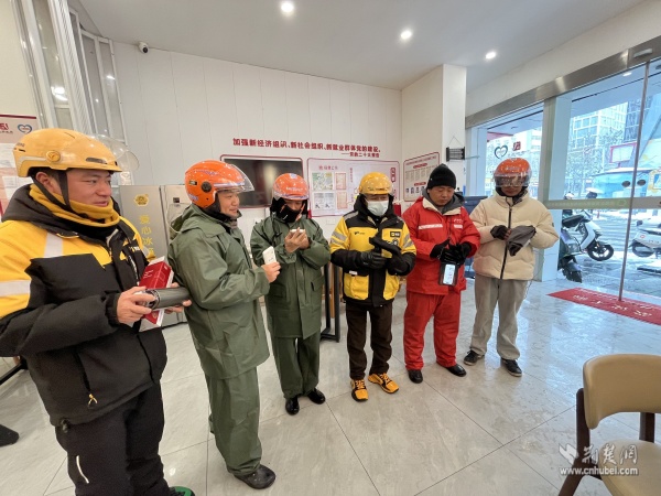 武昌區(qū)總工會維權(quán)服務部負責人夏巨波與街道工會工作人員一邊分發(fā)慰問物資,一邊與大家親切交談:“雪天路滑,騎車千萬要慢行,安全第一?!薄绑A站里備了熱水和微波爐,累了隨時進來歇腳,別凍著自己?!?/p>