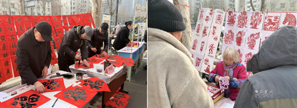 同一時間,在四美塘社區(qū),大紅的春聯(lián)紙、精致的剪紙作品與濃郁的墨香交織,勾勒出吉祥喜慶的新春圖景。武昌區(qū)社區(qū)教育學(xué)院楊園街分校的教師和學(xué)員們布置了書法創(chuàng)作區(qū)、剪紙展示區(qū),吸引眾多居民駐足觀賞。在書法創(chuàng)作區(qū),居民主動參與書寫體驗,在老師的指導(dǎo)下親手描繪新春祝福。在剪紙區(qū),精美的作品整齊陳列,居民們登記后即可領(lǐng)取,將這份獨特的新春祝福帶回家。