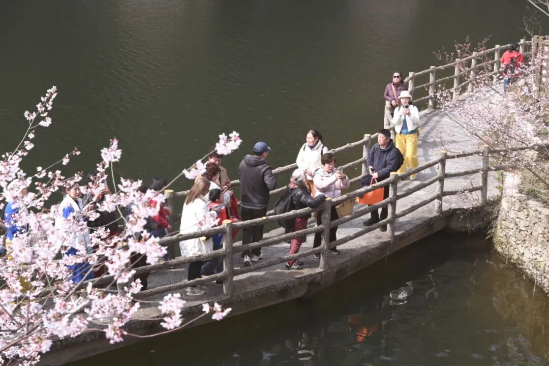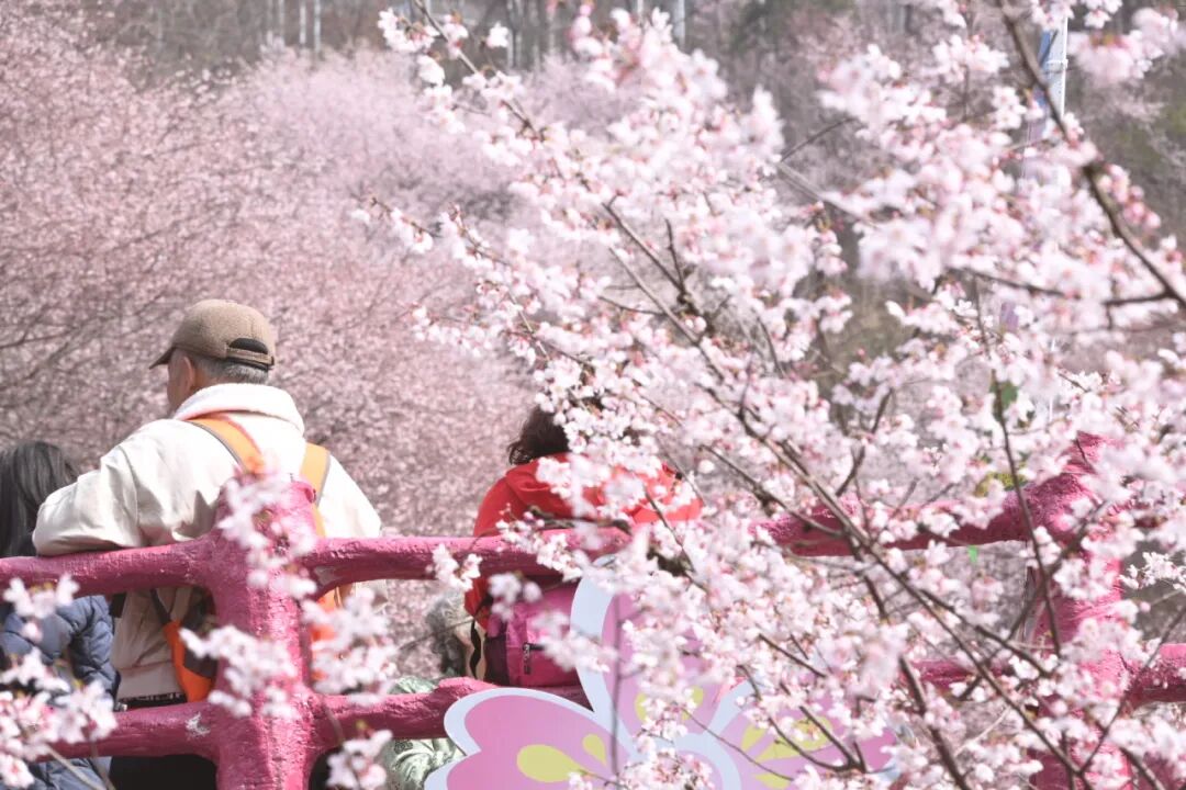 步入景區(qū),綿延道路兩側(cè)櫻花成廊,花枝交錯(cuò)如云似霞。層層花瓣在陽光下熠熠生輝,粉白相間、隨風(fēng)輕搖,勾勒出如夢似幻的春日盛景。游客們漫步其間,拍照打卡、駐足欣賞,在山野間沉浸式感受櫻花與春光的雙重浪漫。
