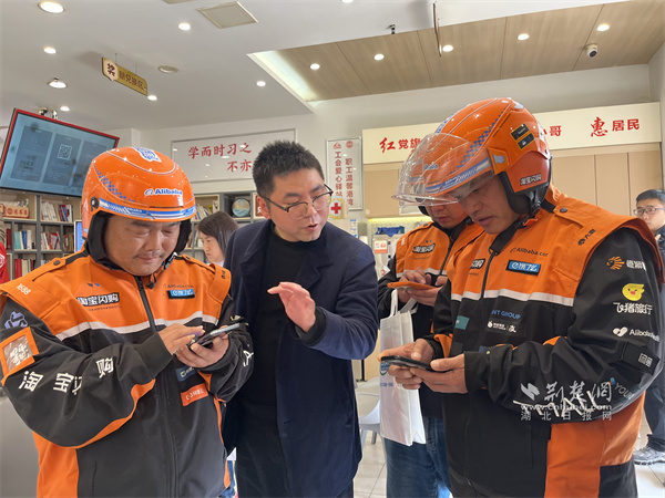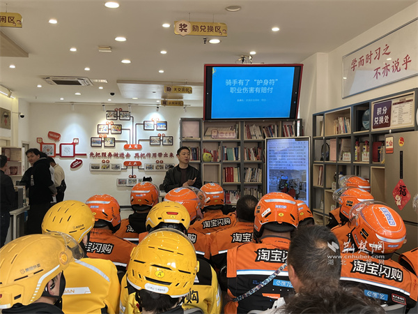 社保處工作人員為騎手介紹職業(yè)傷害保障就醫(yī)政策。 通訊員供圖