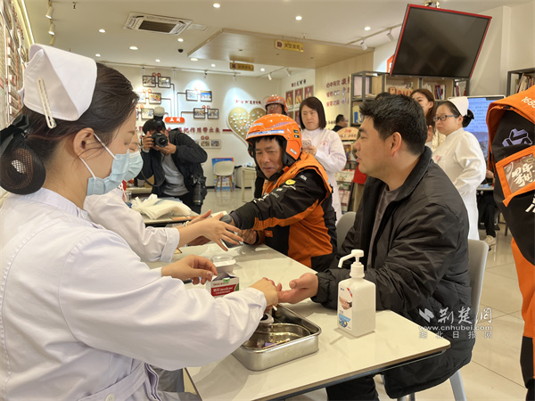 醫(yī)務(wù)工作者為騎手測量血壓和血糖。 通訊員供圖
