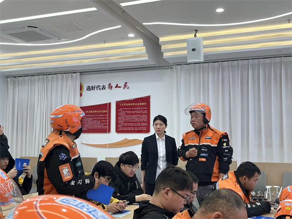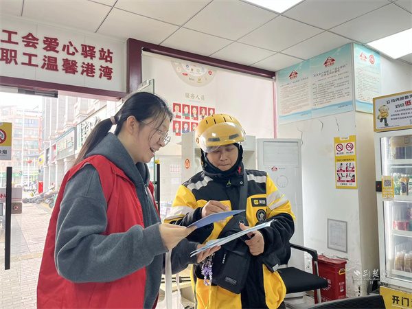 社工到驛站為騎手介紹社保知識(shí)。 通訊員供圖