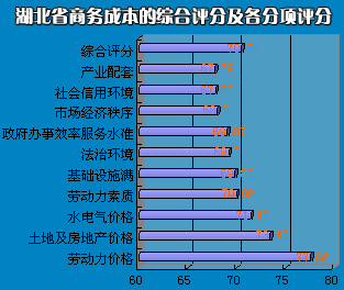 投資者對影響我省商務(wù)成本的十大因素的評價(jià)都較均衡,各項(xiàng)評分介于67.8-77之間,綜合評分70.51,正好位于基本滿意(60)與滿意(80)區(qū)間的中位。較去年同類調(diào)查數(shù)據(jù)相比,提高3.5分。 ……………………………………………………………………