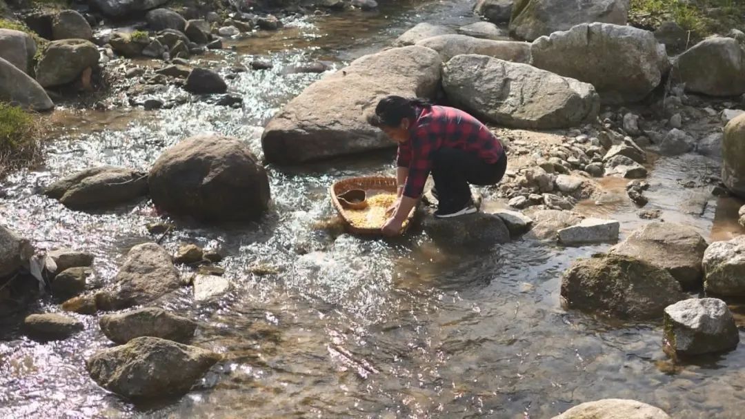 麥?zhǔn)懈勺拥闹谱鲝霓r(nóng)家婦人篩選和浸泡黃豆開始,數(shù)小時(shí)后,浸泡好的黃豆被撈起,在溪流中淘洗,其景可以入畫。