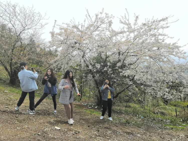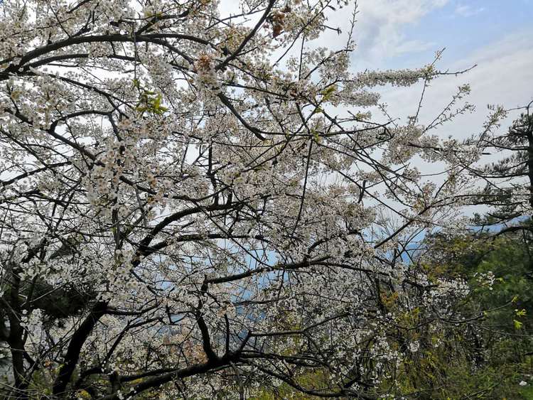 登上山頂,漫山遍野的櫻花開(kāi)放在樹(shù)叢中,大幕的櫻花長(zhǎng)得特別的素雅,游客看了心中便升起一股憐愛(ài)之情。