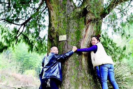 越往山里走,森林越茂密,古樹也越來多。在該村三組的一座老宅后,記者看到一片古樹群。最先映入眼簾的是一棵國(guó)家一級(jí)柏樹,上面布滿黑褐色紋理,樹干得幾人合圍。不遠(yuǎn)處,還有國(guó)家二級(jí)杉榔、二級(jí)柏樹等,整個(gè)山坡,就被大大小小幾十棵大樹遮蔽,其中被掛牌保護(hù)的就有8棵?!拔覀兇逵?1個(gè)自然村灣,每個(gè)灣子都有這樣的原始老林,而且很多都已被掛牌保護(hù),這是村里最大的財(cái)富?!贝逯淌烂髡f。他還給記者講了個(gè)故事,有一年,一家知名公司的人看上這里的樹,他們?cè)敢獬鰞r(jià)三萬元,買走其中一棵,但村民們毫不心動(dòng),當(dāng)場(chǎng)就給拒絕了!