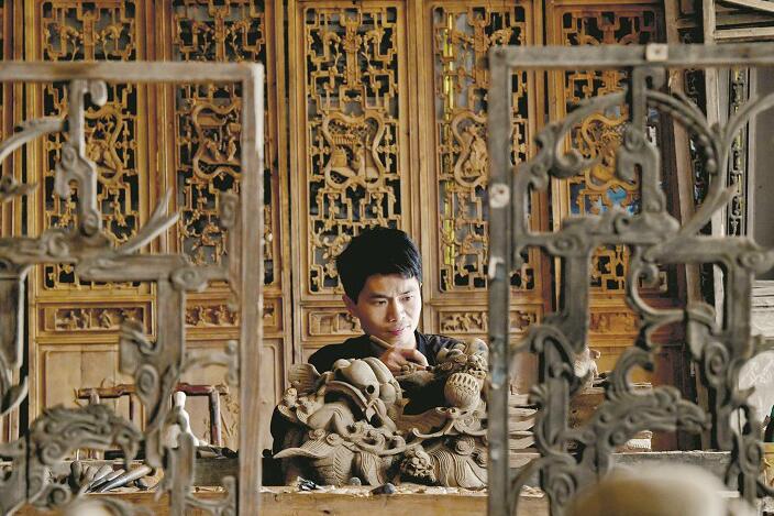 圖為:成希在雕刻房梁,一個(gè)個(gè)人物在他的刀下栩栩如生