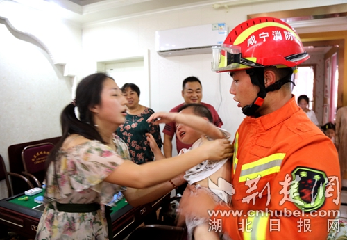 圖為消防員救出小孩現(xiàn)場(chǎng)。 朱濤攝