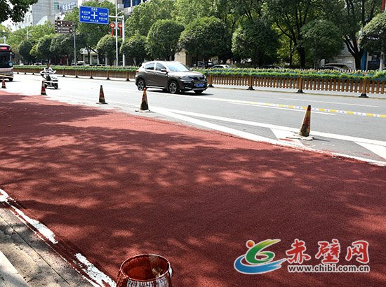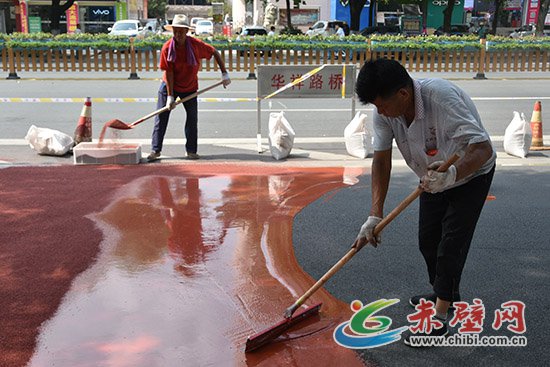 赤壁網(wǎng)消息(記者 聶愛陽)先往地面倒上攪拌均勻的膠粘劑,用推水器推平;再往上撒上陶瓷顆粒,用鐵鏟抹勻。頃刻間,一條嶄新的紅色防滑車道就這樣鋪就而成。8月6日,在赤壁市沿河大道,工人們正在緊張鋪設紅色防滑車道。