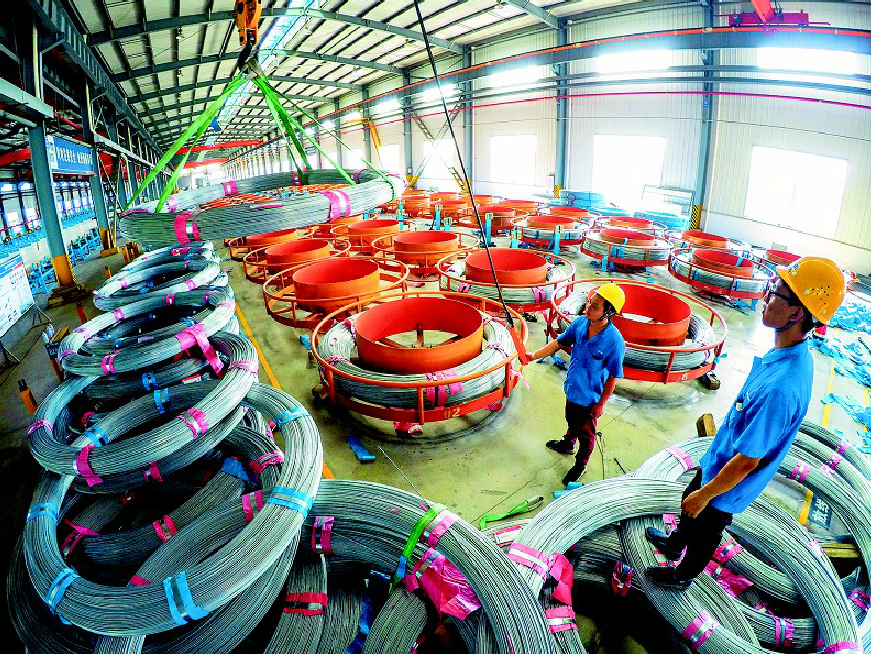 圖為:在嘉魚縣經(jīng)濟(jì)開發(fā)區(qū)官橋工業(yè)園內(nèi),湖北歐維姆纜索制品有限公司員工在加工大橋主纜索股。(湖北日報全媒記者 陳勇 通訊員 張育明 攝)