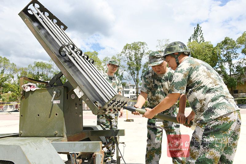 26日,在崇陽縣港口鄉(xiāng)中學,該縣氣象局工作人員正在此架設火箭炮,守候對流云層,抓住有利時機實施人工增雨抗旱作業(yè)。