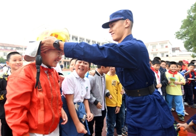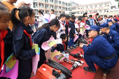 陰雨天氣,絲毫沒有影響師生們的學習熱情。大家對防災減災知識和自救互救技能不停地向消防官兵和志愿者問詢。“我學會了滅火器的使用方法,先拆開包裝,迅速把滅火器搖一搖,然后按下滅火開關。”三(1)班小朋友沈昭對記者說。