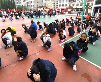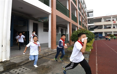 師生們一手捂著口鼻,一手扶著墻壁半蹲行進,緊張、有序、快速地撤離教室,短短的1分56秒,全校師生全部撤離到應急避難場所——學校操場。接著,各班班主任迅速清點人數,向校主任報告完畢,演練結束。