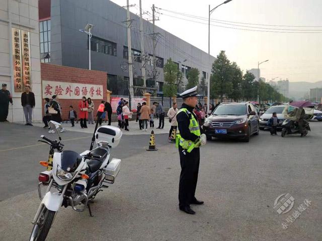 11月22日12:15分,赤壁市第一初級中學(xué)校門口,市交警大隊(duì)正在開展“交警護(hù)學(xué)崗”活動(dòng)。民警在學(xué)生上學(xué)放學(xué)時(shí)段進(jìn)行交通疏導(dǎo),指揮車輛減速讓行,確保學(xué)生安全往返。