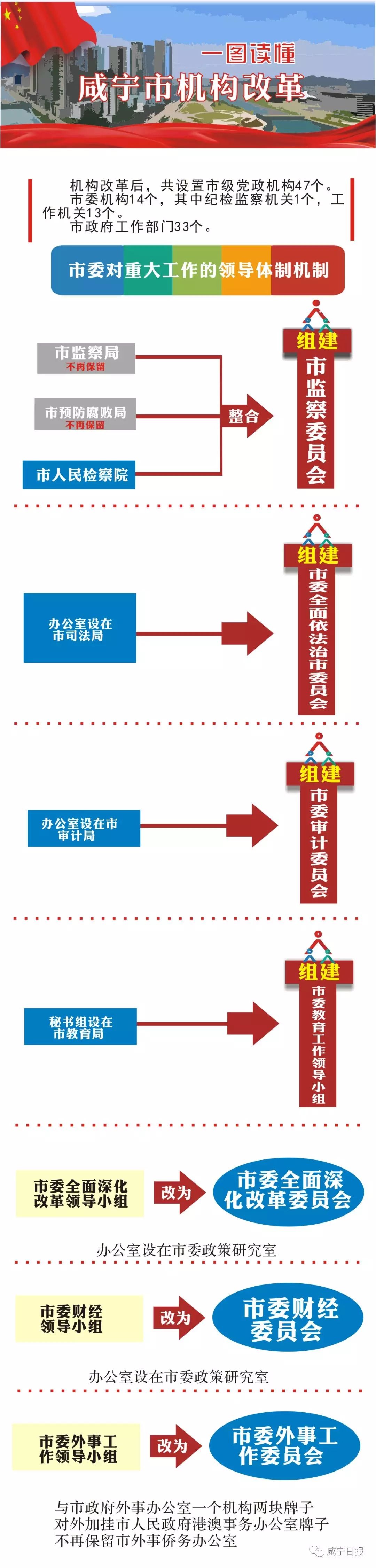 我市召開機(jī)構(gòu)改革動員大會,標(biāo)志著我市機(jī)構(gòu)改革全面啟動。根據(jù)省委省政府批準(zhǔn)的《咸寧市機(jī)構(gòu)改革方案》,本輪機(jī)構(gòu)改革后,市本級共設(shè)置黨政機(jī)構(gòu)47個。市委機(jī)構(gòu)14個,市政府工作部門33個。改革方案還對黨政直屬事業(yè)單位實(shí)施了限額管理,并進(jìn)一步規(guī)范了黨政派出機(jī)構(gòu)置。