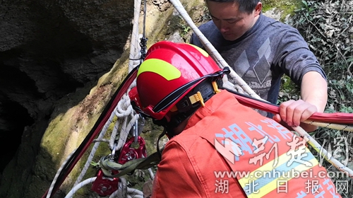因消防車無法抵達,消防員帶上救援工具,徒步半個多小時迅速趕赴事發(fā)現(xiàn)場開展救援。到達現(xiàn)場后,發(fā)現(xiàn)一名三十多歲男性在一個10多米的深洞內(nèi)呼救。經(jīng)與被困者和現(xiàn)場群眾溝通了解,此洞名為藏龍洞,是一個未經(jīng)商業(yè)開發(fā)的深洞,有著悠久的歷史傳說,引來無數(shù)探險者,這名男子也是因為好奇,下洞后體力不支無法再攀爬出洞被困洞底。中隊指揮員根據(jù)現(xiàn)場情況,立即利用救援繩索做好安全支點,消防員何聰點降至洞底查看被困者情況,所幸洞內(nèi)空氣流暢,被困者無二次受傷的危險,消防員利用隨身攜帶的全身吊帶將被困者固定好后,經(jīng)洞外消防員齊力,最終經(jīng)過20多分鐘的救援,被困人員被成功營救出山洞。