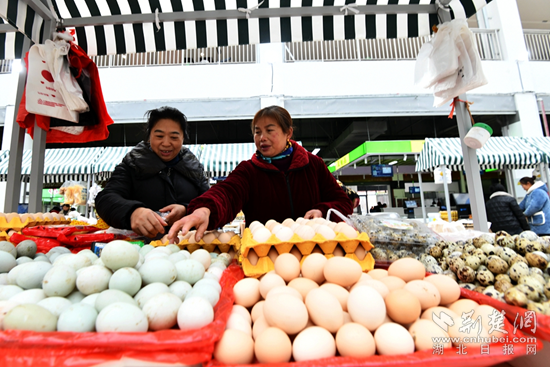 在肉類攤位前,剁了20多年肉砧板的胡金山割肉的手麻利多了——他邊賣肉,邊招呼顧客,今天喜遷新市場,瞧這秤也足足的。排著長隊(duì)購買“兩頭烏”豬肉的顧客不時盯著屏幕上中央電視臺拍攝采訪這位養(yǎng)豬大戶的專題片,有的掃一掃二維碼,看養(yǎng)豬場實(shí)況。