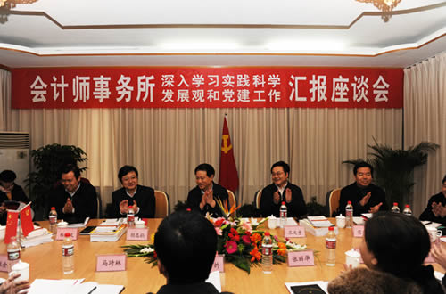 在座談會上,潘立剛同志分別聽取了王文童同志關(guān)于全省會計師事務(wù)所開展深入學(xué)習(xí)實踐科學(xué)發(fā)展觀活動和注冊會計師行業(yè)黨建工作情況的匯報,武漢市財政局總會計師、市財政局會計師事務(wù)所深入學(xué)習(xí)實踐科學(xué)發(fā)展觀活動指導(dǎo)小組副組長張灼、襄樊市財政局副局長、市財政局會計師事務(wù)所深入學(xué)習(xí)實踐科學(xué)發(fā)展觀活動指導(dǎo)小組副組長馬琦林、咸寧市財政局黨組成員、市會計師事務(wù)所深入學(xué)習(xí)實踐科學(xué)發(fā)展觀活動指導(dǎo)小組副組長張麗華以及中勤萬信會計師事務(wù)所黨支部書記、董事長張金才,武漢眾環(huán)會計師事務(wù)所董事長、武漢市注冊會計師行業(yè)黨委副書記黃光松,咸寧永興會計師事務(wù)所所長、咸安區(qū)政協(xié)委員張麗平等同志先后匯報發(fā)言。大信會計師事務(wù)所湖北分所、中瑞岳華會計師事務(wù)所湖北分所、武漢興業(yè)會計師事務(wù)所、襄樊華炬會計師事務(wù)所黨支部書記也參加了此次座談。