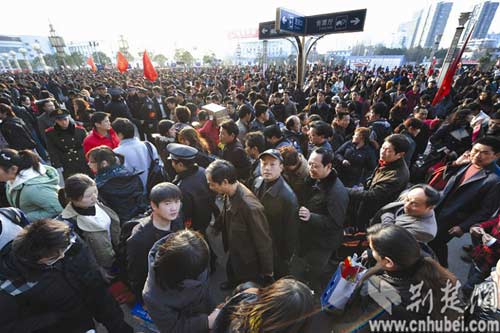 記者今天上午在武昌站采訪了值班站長,她告訴記者,去年春運,買票的隊伍成了長龍,要蜿蜒拐彎延伸到廣場上,而現(xiàn)在售票窗口前,排隊的人大多在二三十人左右。她兩相比對,感嘆還是高鐵緩解壓力。