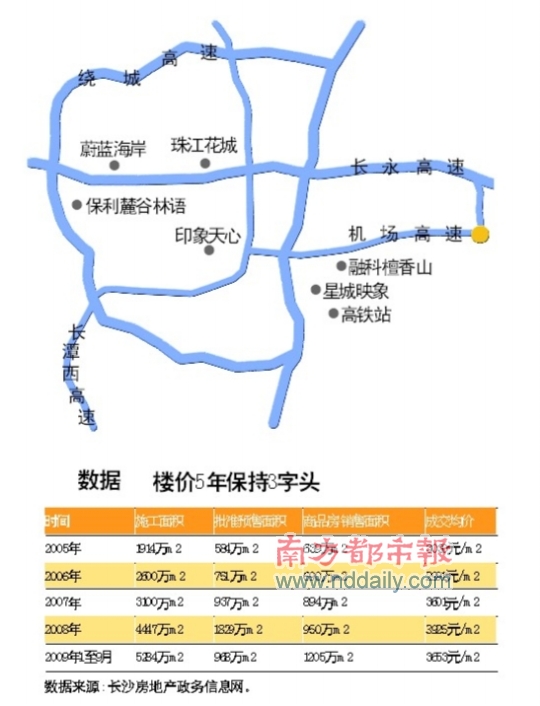 如 果 說 廣 州 是 個(gè)“ 大 工地”,長沙可以說是一個(gè)正在開發(fā)中的“超級(jí)大盤”。打開一張本地發(fā)布的《長沙樓市圖》,發(fā)現(xiàn)地圖上密密麻麻都布滿了樓盤,在這個(gè)占地1.18萬平方千米的大地盤分成了10多個(gè)大型的地產(chǎn)板塊,每個(gè)板塊都有數(shù)十個(gè)樓盤在售。