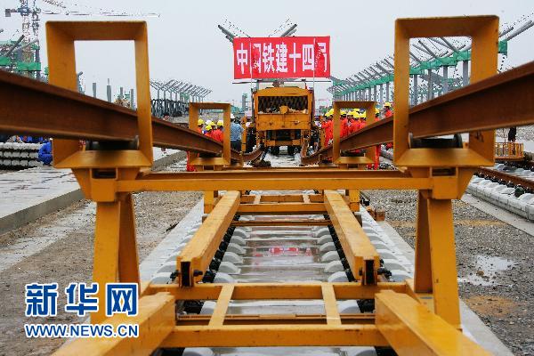 資料圖片:7月17日,中國(guó)鐵建十四局集團(tuán)京滬高鐵鋪軌工班的工人們正在鋪設(shè)通道,為正式鋪軌進(jìn)行準(zhǔn)備。京滬高鐵先導(dǎo)試驗(yàn)段北段將于7月19日開(kāi)始率先從徐州向蚌埠鋪軌,南段將于8月中旬從南京向蚌埠鋪軌,10月底將完成試驗(yàn)段鋪軌。京滬高速鐵路全長(zhǎng)1318公里,全線縱貫京津滬三大直轄市和河北、山東、安徽、江蘇四省,是我國(guó)目前最長(zhǎng)的客運(yùn)專(zhuān)線之一。新華社發(fā)(劉文攝)
