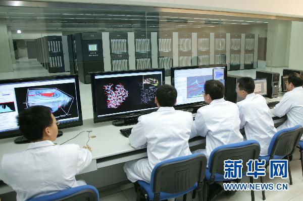 這是科研人員在對(duì)“天河一號(hào)”超級(jí)計(jì)算機(jī)進(jìn)行系統(tǒng)性能測(cè)試(資料照片)。 新華社發(fā) (何書(shū)遠(yuǎn) 攝)