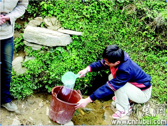 圖為:支教生活艱辛,但鍛煉人的意志。圖為支教生丁記峰從小小洞口里取水。